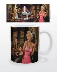This is a brand new, officially-licensed, 11 oz mug featuring artist Chris Consani's Java Dreams. Java Dreams places four legends, Marilyn Monroe, James Dean, Humphrey Bogart, and Elvis Presley, together in a coffee shop. The mug was produced by Pyramid America and will come in a black mug box, perfect for gift-giving. The image shows what the full wrap-around design of the mug looks like. The mug is both microwave and dishwasher safe.