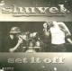 This is a vintage, approximately 12" X 12" promotional item known as an LP or Album Flat. Flats are thin pieces of cardstock that serve as posters and have traditionally been sent to record stores to promote an upcoming LP/CD by an artist. This flat is double-sided and is advertising the release of the 2000 Shuvel album entitled Set It Off. The flat remains in FAIR condition with small spots of paper loss on both sides where tape had been removed after hanging, and one piece of scotch tape remains on the front side of the flat near its lower left side.