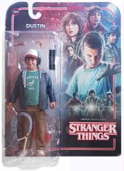 This is an officially-licensed, approximately 6 1/2-inch action figure of Dustin from the hit Netflix series Stranger Things. The figure was produced by McFarlane Toys in 2018 and remains new and sealed in its original GOOD-conditioned packaging. The packaging's backing card has creasing across its hook area.