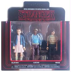 This is an officially-licensed, 3-pack set of approximately 3 3/4-inch action figures from the hit Netflix series Stranger Things. Included in this set are figures of Eleven, Lucas, and Mike. The figures were produced by Funko during the early years of the series. The figures remain new and sealed in their original VERY GOOD-conditioned packaging. The packaging has a tiny crease on its backside and mild edge and corner wear.